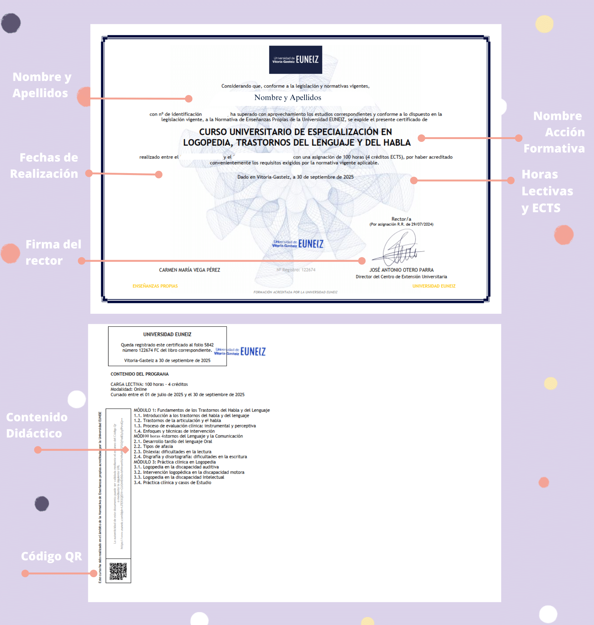 Además de los datos identificativos personales de la alumna/o, el certificado contiene las horas totales dedicadas a esta formación, así como el contenido didáctico del curso distribuido en diferentes módulos formativos.